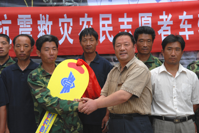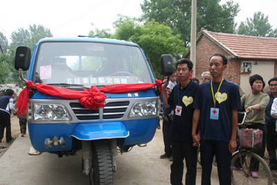 莒县洛河镇东皂湖村刘中明等10位农民自发组成救援队驾五征三轮车43夜昼夜不停,历经3000公里艰难行程,奔赴灾区一线抗震救灾的壮举感动了全国人民,更感动了五征干部员工。近日,集团公司领导胡乃芹、孙永存先后到莒县洛河镇东皂湖村,慰问农民救援队,向他们致以崇高的敬意,并向车主刘中亭赠送了一辆价值近3万元的全新 “金牌全家福”三轮车。三包服务中心也派专业服务人员为赴川抗震救灾三轮车辆进行了免费养护维修。