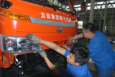 四川汶川大地震牵动了8000名五征干部员工的心,5月14日,五征干部员工先后向灾区人民捐款近40万元。针对灾后重建需要工程机械的实际,五征集团决定再向灾区捐赠工程机械,帮助灾区加快重建进度。5月20日,五征集团组织技术人员进行了论证选型,最后确定捐献转弯半径小、载重量大、通过性能强的“五征天骄”工程自卸车,并对设计生产检验等工作进行了分工。设计部门组织技术骨干对车辆关键部件进行了优化加固设计,5天时间就将改进方案提交给了生产部门。调度中心制订了最佳生产、采购计划,质检部门深入关键部件生产厂家把关采购检验。6月3日,所有零部件组织到位,承担生产任务的五征轻型车公司对赈灾捐赠车的生产任务高度重视,组召开了专门会议,统一认识,对生产标准进行了严格规范,并要求车间班组层层动员,力争拿出最高的制造水平,向灾区人民奉献精品工程车。