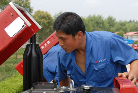拖拉机装配调试现场,试车员徐斌,来到抽到的车辆前,凭借多年的试车经验,一会瞅瞅轮胎,一会调整线束走向,一会看看发动机皮带型号,不一会的功夫,原本设计的左右轮胎不一致、发电机皮带型号误装、离合踏板自由行程、方向机与车架紧固螺栓松动等故障问题,都没能逃过他的“火眼金睛”,都被一一找了出来,并经调试达到标准。