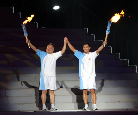 22时06分,开幕式晚会进入火炬传递阶段。在人们的欢呼声中,姜卫东董事长高擎主火炬,迈着矫健的步伐,开始了主火炬的传递。霎那间,音乐响起,全场沸腾,火炬传递燃起了人们的激情,他们全体起立、摇摆旌旗,“同一片海,同一个家”、“加油、加油”的口号此起彼伏,在场的万余名观众纷纷以最热烈的欢呼声和掌声为姜卫东董事长呐喊助威。火炬传递把整个晚会推向了高潮,晚会现场成为欢乐的海洋。