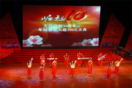 庆典活动中,五征还举行了精彩、宏大的文艺演出。与会者在婉转悠扬的旋律中重温了五征十年风雨如磐的历程,体味了五征那段激情岁月的故事。开场鼓乐《春》,鼓声铿锵有力、节奏抑扬顿挫,拉开了整场演出的序幕;诗朗诵《五征放歌》道出了五征如同一只涅槃的凤凰,带着现代企业制度的生机和活力,呈现于世人面前;小合唱《回娘家》的诙谐幽默,成为演出的温馨小插曲,令全场笑声不断;歌伴舞《一样的月光》演绎着活力与激情,将全场的气氛推向高潮;《日照我眷恋的故乡》的美妙旋律弥漫在全场的每一个角落,诉说着五征与日照、与五莲的血水深情;大合唱《咱们工人有力量》、《歌唱祖国》,象征着站在一个新的更高的起点上,五征将奋力开拓,不断超越自我,开创民族工业更加灿烂辉煌的明天,也表达出了实现百年五征梦想的信心和决心。