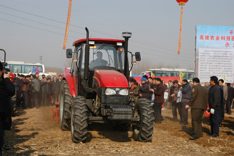 此次现场会吸引了20多家农机生产企业参加。现场会规模空前,阵容庞大。五征集团旗下的五征牌、泰山牌18-120马力全系列拖拉机,翻转犁、旋耕机、深松机等60多台套农机具齐装上阵。伴着技术人员的介绍,配套五征、泰山系列拖拉机的各种犁具出场了,几分钟的时间就把近千亩的地块深松完毕,一片片均匀、平整的地块呈现在人们面前,得到领导、专家的充分肯定,展示了五征农装产品风采,也显示了五征向现代、高效、精准作业机械方向调整的发展战略和打造五征现代农装品牌,做大做强现代农业装备产业的信心和实力。