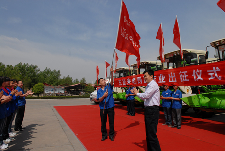 麦收跨区作业队队长潘曰山从农业装备公司总经理苑忠亮手中接过队旗
