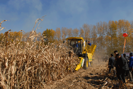 随着主持人的介绍,配套22马力拖拉机的两行玉米收获机出场了,这款设计带有脱皮机的机型,在人们的一片赞叹声中,将400米长的地块仅用10多分钟就收获完毕;接着,配套90马力泰山拖拉机的三行玉米收获机登场了,该产品凭借成熟的技术,强劲的动力,表现出了良好的性能,赢得了参观者高度评价;三行玉米收获机走过之后,紧跟其后的就是四行玉米收获机,该机型属五征首创,采用背负式结构,配套100马力泰山拖拉机,宽大的前置式割台,实现了自行开道,离地间隙的可调性彰显了其良好的操纵性能,拨禾轮加拨禾链的主动喂入方式成就了收获机的全幅不对行收获。新型焊接摘穗辊大幅度提升了工作性能,独特的摘穗辊护罩又保证将果穗的破碎率降到最低。大容积粮仓减少了卸粮次数,再加上液压自动卸粮和高位卸粮,极大地提高了生产效率。收获现场该机型以其性能稳定、机收高效表现出色,博得入会领导、专家一致好评。