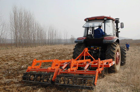 深松联合整地机采用了国外进口的减震深松系统,深松深度达40cm,遇到障碍物时,高韧性、高强度的特制弹簧会拉动弹齿,自动弹起,避免弹齿或产尖破损。越过障碍后,弹簧会自动回复到原来的位置,弹齿铲尖继续作业。采用平行四杆机构,实现碎土轮的浮动作业,达到在不影响深松深度的条件下作业。一次作业可完成深松、碎土、整平等多项工序,适用范围广。同时机具作业速度高,从而提高了作业效率。该机具有结构坚固,性能可靠,田间通过性好,作业效率高等特点,是与大马力拖拉机配套的理想机具。