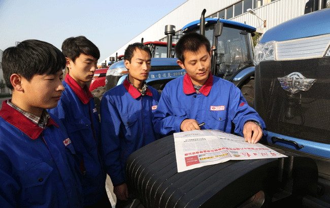 连日来,五征集团各部门、事业部利用班前班后、工休时间组织员工学习党的十八届三中全会公报,深刻领会公报精神,并利用会议、报刊、网络、宣传栏等多种形式,号召全体干部员工解放思想,抢抓深化改革机遇,以工业化和信息化促进企业管理和技术升级,以城镇化和农业现代化推动产业和产品升级,求实、改善、创新、变革,实现企业发展和升级的新突破。图为农业装备事业部员工在雷诺曼拖拉机前学习公报。
