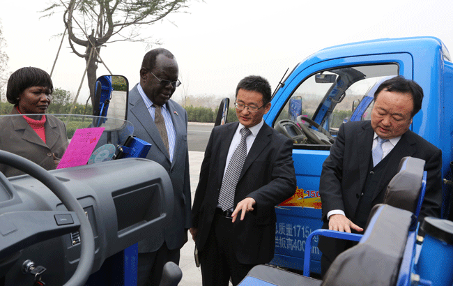 五征农用车以其一流的设计水平与制造水平赢得了业界及用户的肯定,产品不仅遍及神州,还畅销海外。图为南苏丹共和国驻华大使伊鲁赞·毛肯博士专程来五征考察农用车产品。