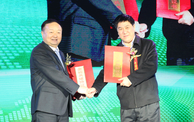 山西省农机局牵头全省部分农机合作社、农业合作社与五征集团签订了“企社共建”框架协议。左义河局长和姜卫东董事长交换框架协议文本