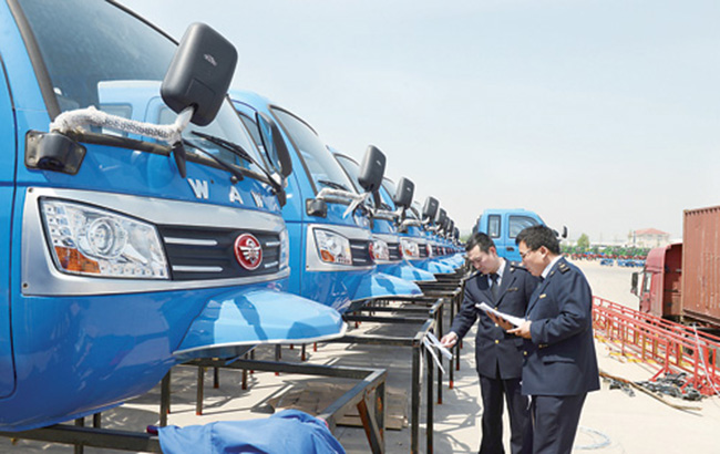 5月13日,在山东日照的五征集团货场,山东日照检验检疫局工作人员检验即将运往非洲的农用三轮车。当日,由中国政府无偿援助毛里塔尼亚的435辆农用三轮车在山东日照检验合格后装船起运。据了解,本次项目共包括2550辆农用三轮车,总价值6000多万元,从2013年12月份起分4批陆续运往非洲,这是最后一批。