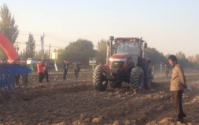 演示会现场两台牵引五铧犁的五征雷诺曼2104拖拉机,向参会的各位嘉宾演示了动力换档、自动故障检测等国内外较为先进的拖拉机操控技术,五征雷诺曼系列拖拉机全部采用按钮操控,不用踩离合器就可轻松换挡,减少换挡停机时间,作业效率可提高20%。自动故障诊断系统通过对提升器控制、行驶制动、农具连成一体,减少物理接线,实现更快速的故障诊断分析,使拖拉机机组有机统一,工作更高效、智能。全车关键零部件采用全球采购模式,采用世界知名品牌传动系、液压操控系统,品质更有保证,完全可替代进口大功率动力拖拉机,适合新疆地区大面积作业的需求。