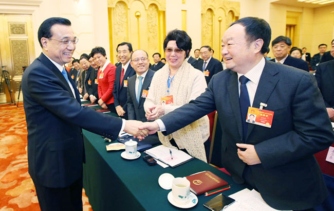 中共中央政治局常委、国务院总理李克强参加山东代表团审议时与姜卫东代表亲切握手(新华社-姚大伟-摄)