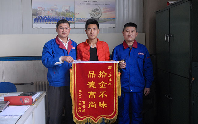 3月30  日上午,一个名叫葛安鹏年轻小伙将一面绣有“拾金不昧、品德高尚”的锦旗专程送到了五征农用车后桥车间,感谢在这里上班的员工厉建果拾金不昧的高尚品格。
