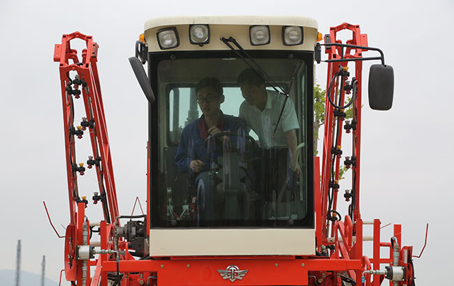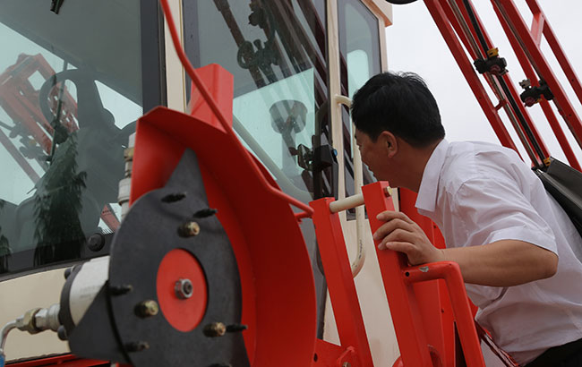 早上9点,试乘试驾开始,淅淅沥沥的小雨下得正欢,但是这丝毫没有阻挡现场农机手的试乘试驾热情。来自日照市一农机合作社的张大哥一来就瞄准了四轮自走式喷杆喷药机18米的大喷幅,主动要求工作人员与他一起登机体验。在工作人员的操纵下,四轮自走式喷杆喷药机展开喷杆,如同大鹏展翅一般,穿梭在试乘试驾现场。体验过后,张大哥对喷杆喷药机赞不绝口,他说,这台机器喷幅这么大,没几个来回就能干完一亩地,真是太省劲了,我准备买上一台!