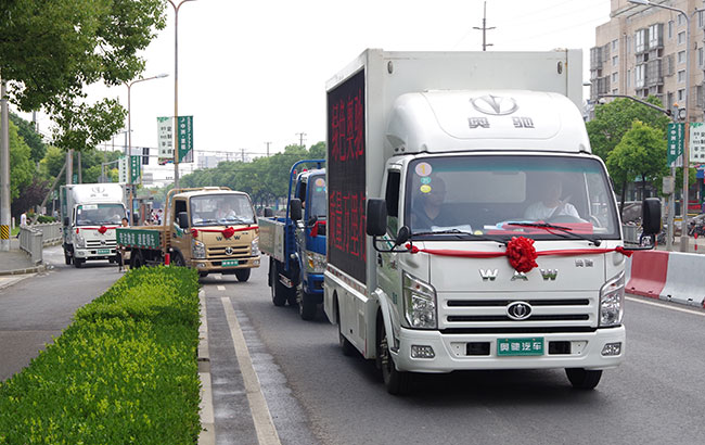 近日,绿色奥驰万里行车队驶入上海,宣传奥驰产品,力谋上海滩。