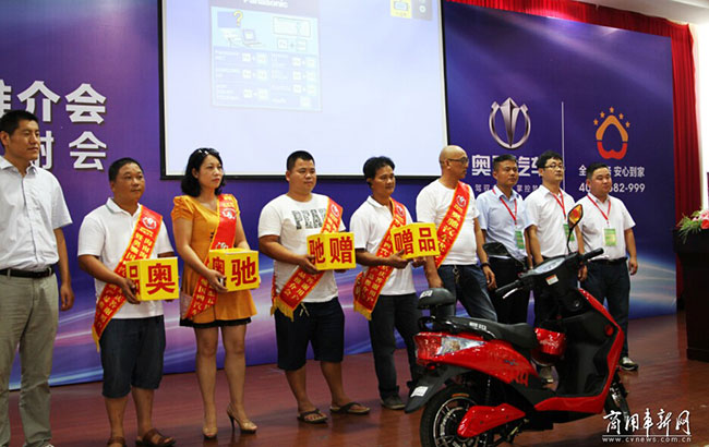 奥驰汽车在室内会议上为客户代表举行了颁奖和授牌仪式,奖项有用户功勋奖、用户贡献奖以及用户优秀奖,奖品分别为电动车和4G智能手机,可谓财大气粗,有钱任性。
