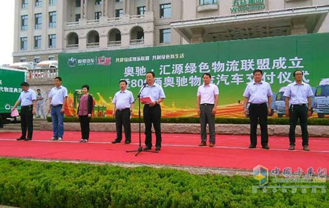 2015年6月30日,奥驰汽车800台产品成功交付汇源果汁集团,同时奥驰·汇源绿色物流联盟成立!!奥驰汽车与汇源果汁集团的合作,既是奥驰汽车秉承高效、环保理念,进军绿色物流新市场获得的第一大单,也标志着奥驰汽车结盟饮品巨头打破“行业围墙”,开启了绿色物流新时代。