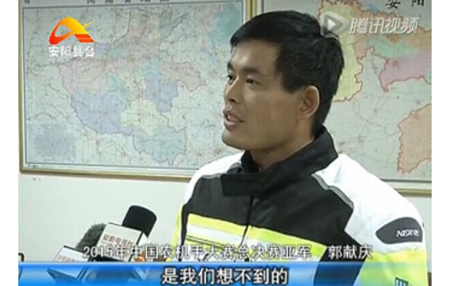 同期声 2015年中国农机手大赛总决赛亚军 郭献庆:“我们能够取得这么好的成绩,是我们想不到的,我心里特别高兴,为咱们安阳人增了光,成绩只代表过去,今后我们会更好的在实际中学习农机技巧,服务好父老乡亲,展示出我市农机手的风采,争取明年(比赛)取得更好的成绩。”
