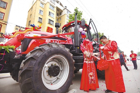 5月28日,五莲县赵永辉夫妇用五征雷诺曼拖拉机当婚车。