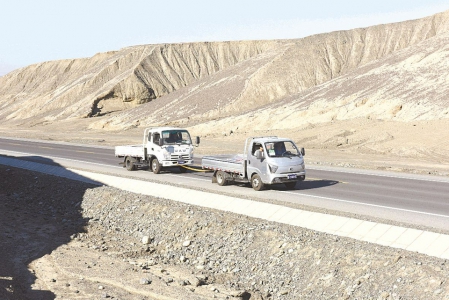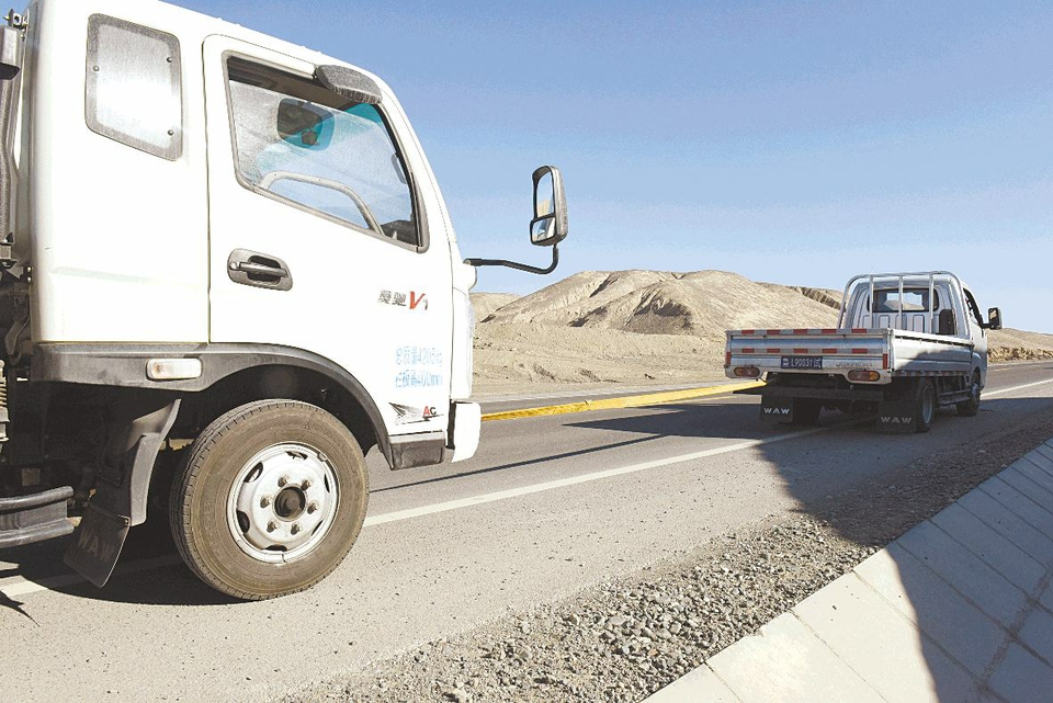 在吐鲁番一处长坡上,记者看到一辆满载的奥驰W2新车正拖拽着一辆奥驰国V新车缓慢行驶着。“为了让发动机在最大功率与扭矩下进行该项试验,技术人员采用了负荷拖车的方法,确保达到最佳试验效果。”试验车队技术人员张甲欣告诉记者,这个试验项目需要车辆在40度以上高温环境下,发动机运行到最大功率最大扭矩的情况下,对发动机的各项性能、指标进行测试。试验要求是在长陡坡上进行,吐鲁番找不到合适的场地,为了实现最大功率、最大扭矩作业,他们想出了这个负荷拖车的办法。