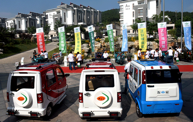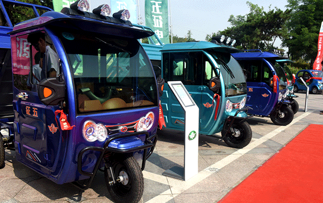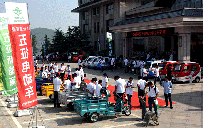 五征机车科技有限公司本次全新推出的新产品包括三开、半蓬、全蓬三个系列的电动三轮车及一个系列的电动四轮车产品,在多彩的水旗的映衬下,五征机车科技新产品分外靓丽,来自全国各地的广大经销商围在自己感兴趣的产品前,有的询问产品价位、有的询问载重空间、有的询问续航里程……