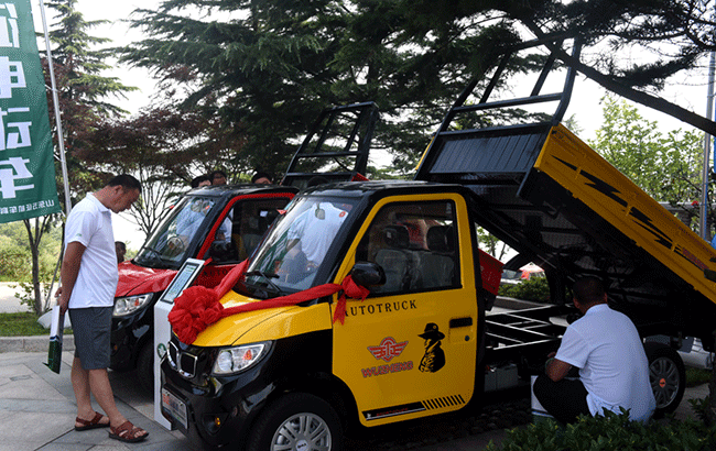 在五征机车科技公司创新推出的电动四轮四座卡车周围,经销商为创新产品所吸引,进入驾驶室看内饰、掀起货箱看底盘,忙得不亦乐乎。经销商纷纷表示,这款车在行业内绝对是首创产品,买了好多年的电动车产品都没见过又能载人又能拉货的电动四轮卡车。这台车拥有一体车架、全冲压车壳、豪华汽车座椅+内饰及宝马前中网,高端大气上档次,定了绝对能大卖。