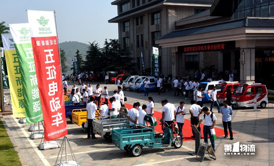 五征机车科技有限公司本次全新推出的新产品包括三开、半蓬、全蓬三个系列的电动三轮车及一个系列的电动四轮车产品,在多彩的水旗的映衬下,五征机车科技新产品分外靓丽,来自全国各地的广大经销商围在自己感兴趣的产品前,有的询问产品价位、有的询问载重空间、有的询问续航里程……