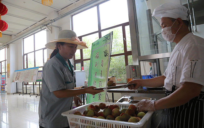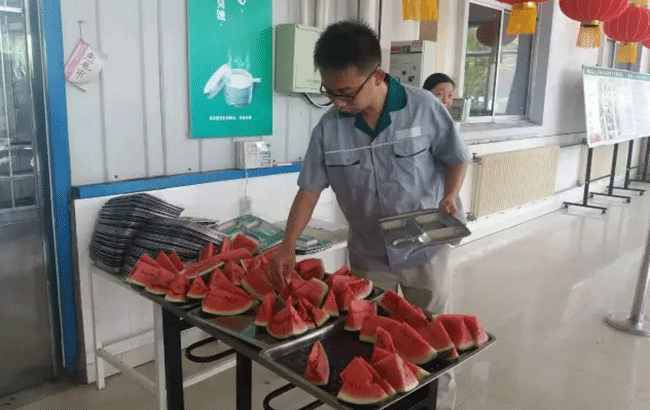 为了避免员工中暑,餐厅工作人员对食品原料严格把关,努力让员工吃到最卫生、最新鲜的饭菜。同时,为员工提供西瓜、苹果等水果,让员工真正感受到五征大家庭的温暖。