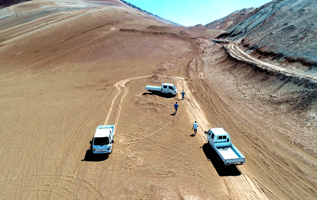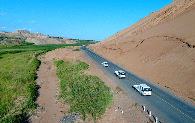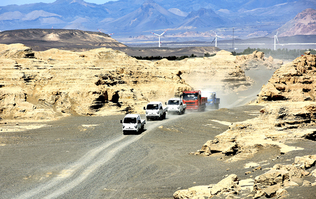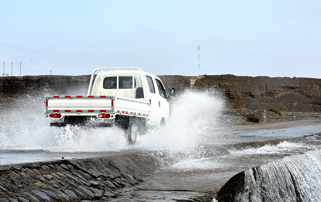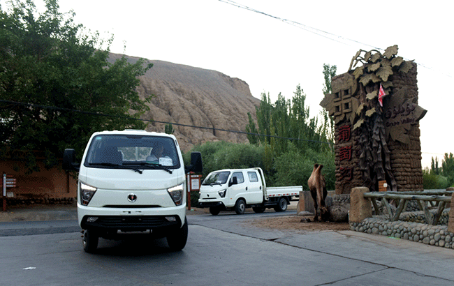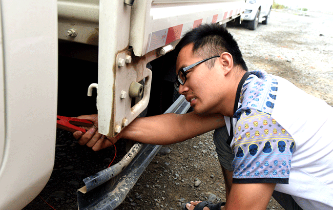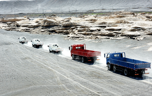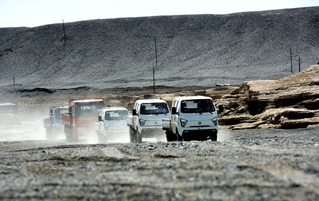 在吐鲁番一处长坡上,一辆满载的缔途双排新车正拖拽着一辆奥驰中卡缓慢行驶着。这是缔途双排车型正在进行整车热平衡试验的现场。技术人员介绍,这个试验项目需要车辆在40度以上高温环境下,发动机运行到最大功率最大扭矩的情况下,对发动机的各项性能、指标进行测试。试验要求是在长陡坡上进行,吐鲁番找不到合适的场地,为了实现最大功率、最大扭矩作业他们想出了这个负荷拖车的办法。