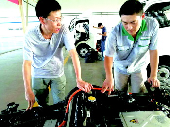 8月24日下午,在五征汽车设计研究院的试制车间,张作功正在向车间工作人员了解车辆试制情况。“研发设计完成后,我们会进行实物的样车试制,样车试制完成后再进行性能试验和可靠性试验,最后再针对发现的问题一个个不断调试解决。”张作功说。