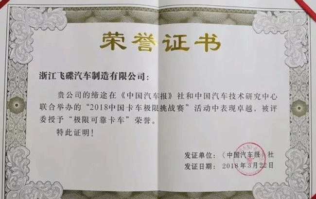 3月22日,2018中国卡车极限挑战赛颁奖典礼在北京人民日报社新媒体大厦举行,飞碟缔途荣获“极地可靠卡车”荣誉。