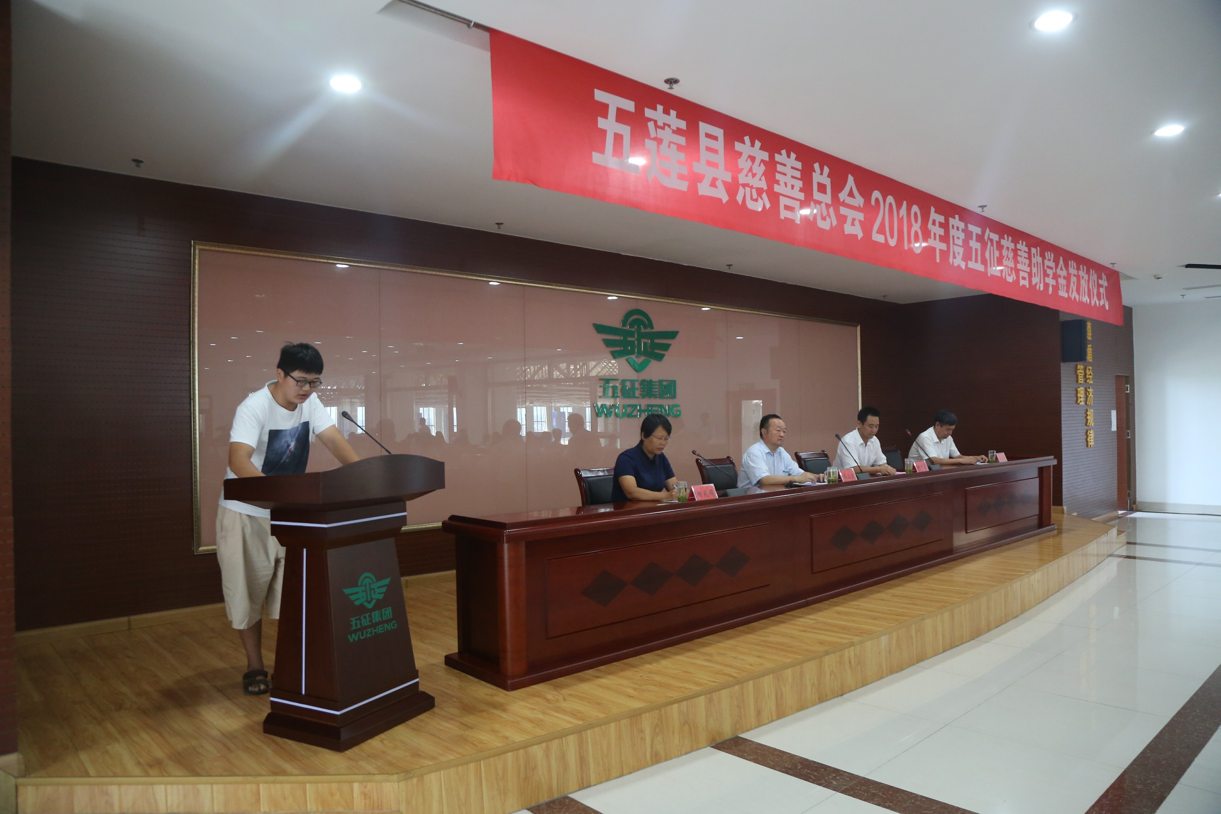 县慈善总会名誉会长、五征集团董事长姜卫东在仪式上讲话,向不畏生活艰辛、在逆境中拼搏成长的同学们表示亲切的慰问,并对即将迈入大学校园的同学表示热烈的祝贺,同时希望他同学们要自强不息。发扬艰苦朴素的生活作风,完成学业,自信生活。立志成才,勤奋学习,掌握新本领、增长新才干,实现我自价值。要心怀感恩。踏实做人、勤奋做事,回报社会、回报家乡,成为对国家、对社会有用的人才。