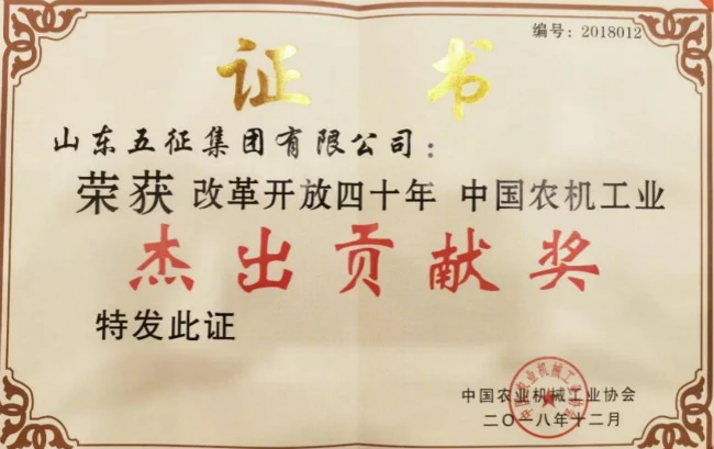 12月6日,由中国农业机械工业协会组织的改革开放40年中国农机工业杰出贡献人物和企业表彰活动在北京举行。五征集团荣获改革开放四十年中国农机工业杰出贡献奖,姜卫东董事长荣获改革开放四十年中国农机工业功勋奖章。