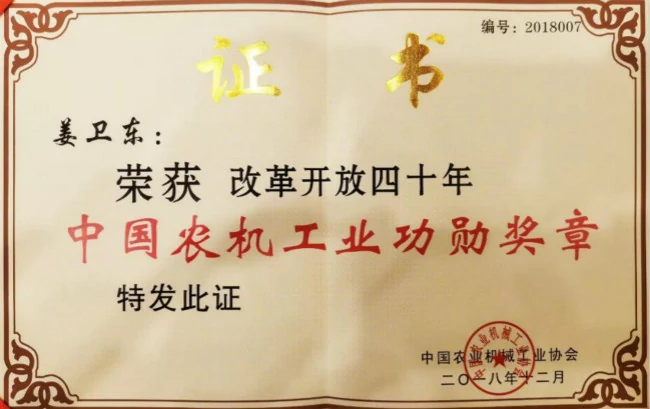 2018年是我国改革开放实施40周年。40年来,在党的改革开放路线方针指引下,我国农机人发扬艰苦奋斗、改革创新的时代精神,涌现出一批优秀人物和先进企业,他们为我国农机工业的发展和进步做出了杰出贡献。为了褒奖他们的贡献,弘扬勇于进取的创新精神,推进新时期我国农机工业高质量发展,中国农机工业协会对改革开放40年来为我国农机工业发展做出杰出贡献的人物和企业进行表彰,授予姜卫东等15位同志“改革开放40年中国农机工业功勋奖章”,山东五征集团有限公司等20家企业“改革开放40年中国农机工业杰出贡献奖”。