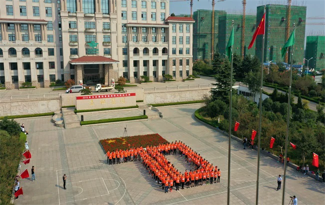 为庆祝新中国成立70周年,五征集团在总部广场用6000多盆鲜花组成了五星红旗,200多名五征员工手持国旗摆成数字“70”庆祝。