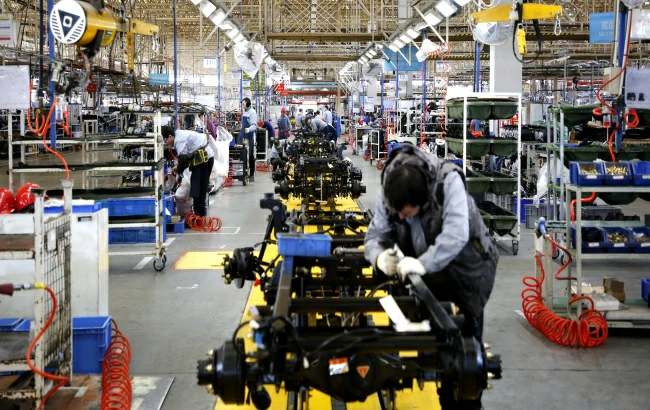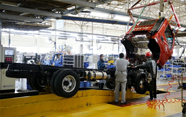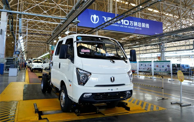 在飞碟汽车装配车间,记者看到的是一派热火朝天的工作场景,两条装配流水线正在开足马力生产,驾驶室布装、车架布装、发动机安装、轮胎安装……人机互动,紧张有序,每隔3分钟就有一辆飞碟汽车下线。