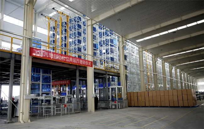 据介绍,飞碟汽车自动化立体仓库总投资3300万,占地3072㎡,配置7700个货位,包含5台双立柱单伸堆垛机,两层钢平台及输送系统,2台提升机,1台RGV,4台激光导航AGV等。
