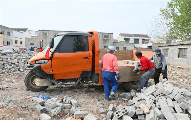 一批高端农用车加入到了城市建设的进程中,推进了城市化建设的脚步。一处拆迁工地上橘黄色的五征迈昂三轮车格外显眼。