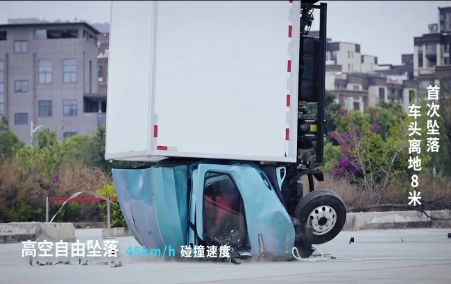 8米的高度相当于45km/h的碰撞速度,这是怎样一个概念呢?根据国外研究机构的调研结果显示,碰撞事故死亡率与车速并没有明显的正相关的关系,而是跟碰撞时的相对速度相关,用45km/h的碰撞速度可以模拟商用车125km/h的高速工况碰撞情况。