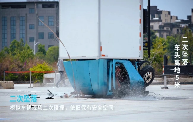 伴随着一声惊天巨响,崔博士的话得到了验证,飞碟W5笔直落地,驾驶室只有轻微变形。如此乐观的结果得益于飞碟W5打造移动堡垒的匠心巧思:车身采用龙骨式驾驶舱结构,标配车门防撞梁,33%超强钢车身、热成型钢A/B柱实现了对驾乘人员360度全包裹式防护,满足欧洲碰撞安全标准,大大提升了驾驶室的安全性;同时飞碟W车前也设有高强度防撞梁,最高可承受16吨重压;此外,在中控仪表的设计中,飞碟汽车也考虑到了安全性需求,通过合理布局,显著减少碰撞发生时仪表板的影响,从而达到对驾乘人员最大程度的保护。