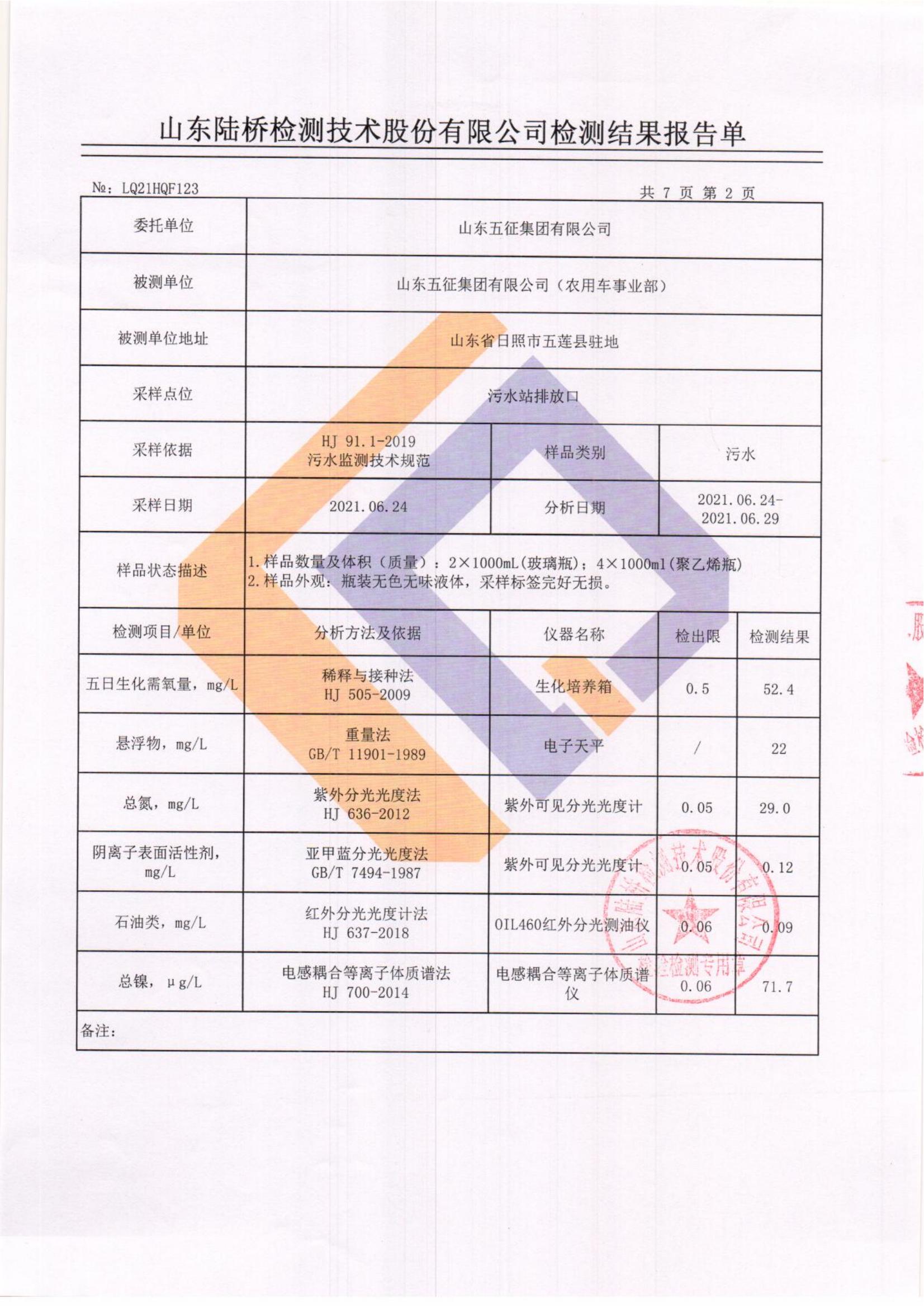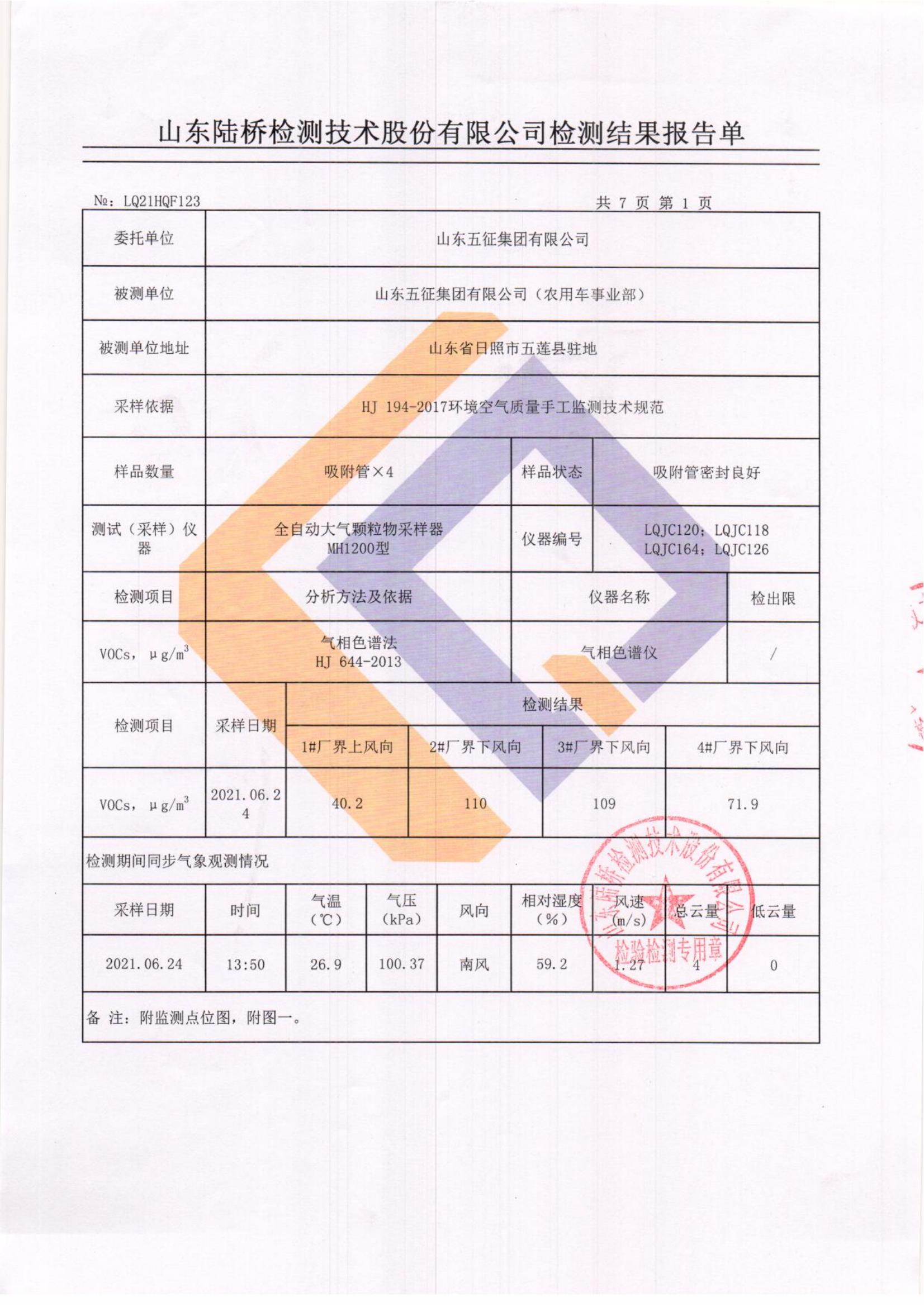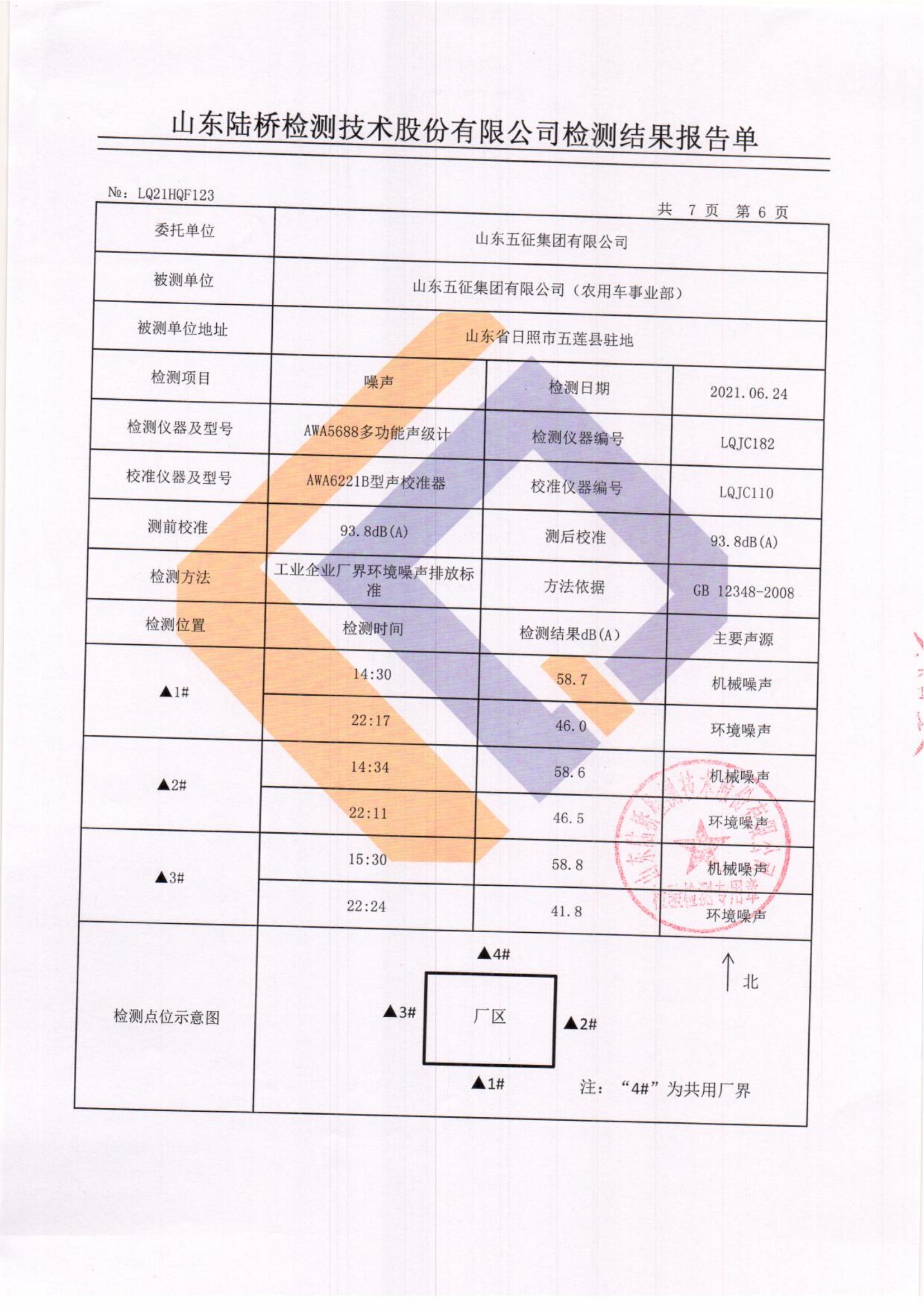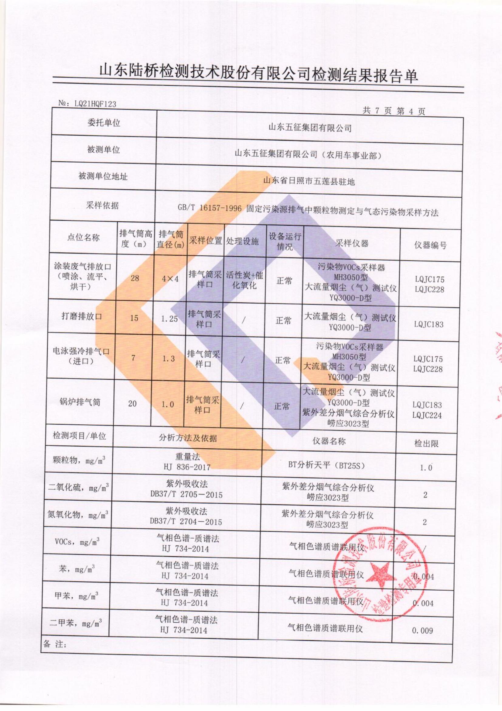 山东五征集团有限公司2021年第二季度环保例行监测数据公示