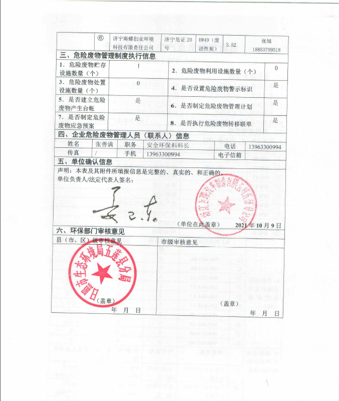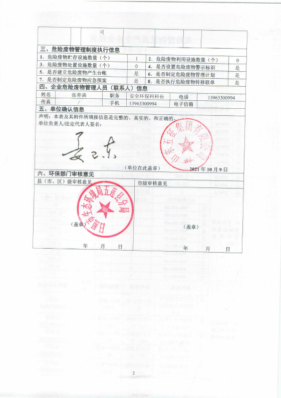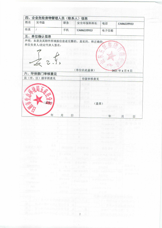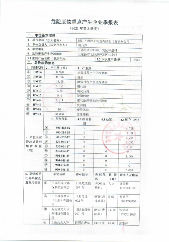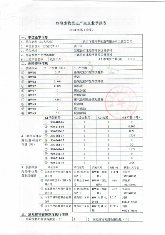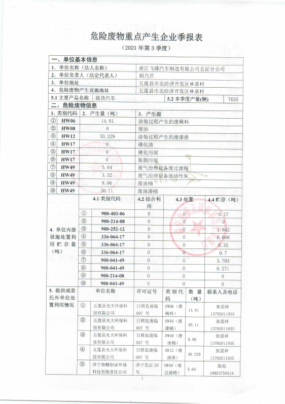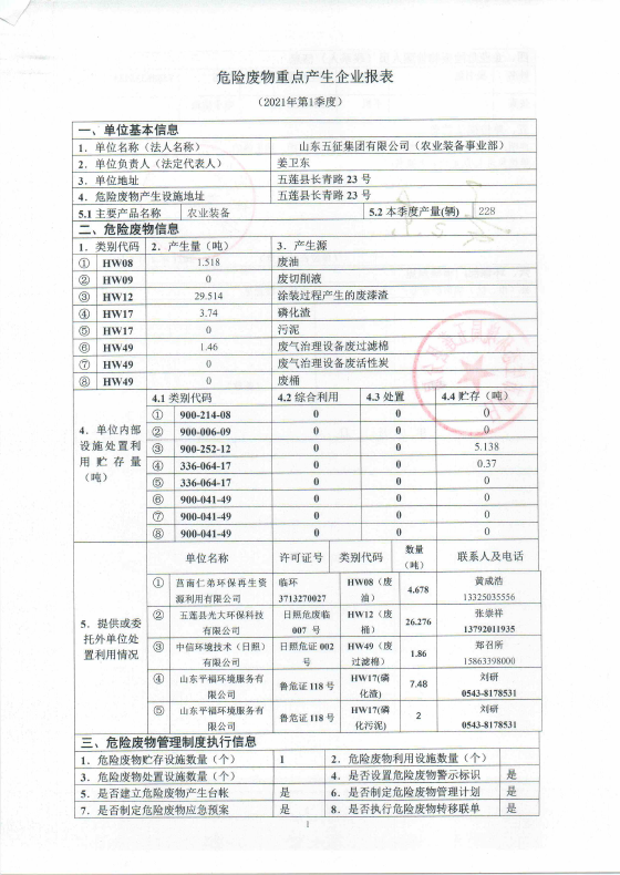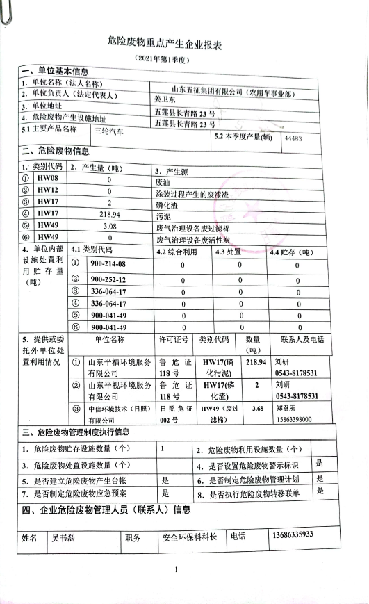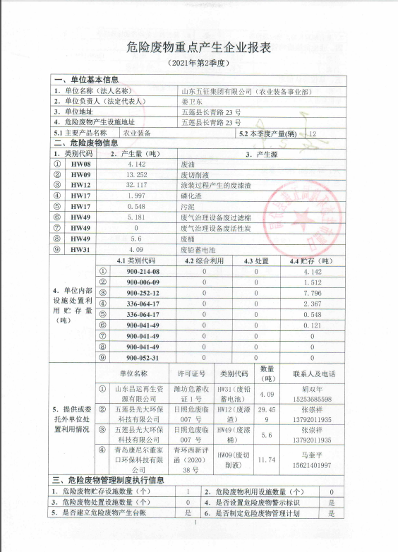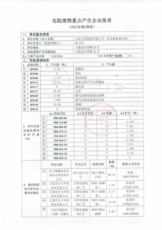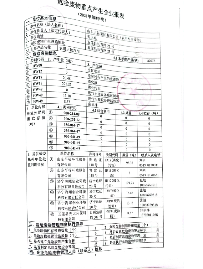 山东五征集团有限公司危险废物信息公开(2021年一、二、三季度)