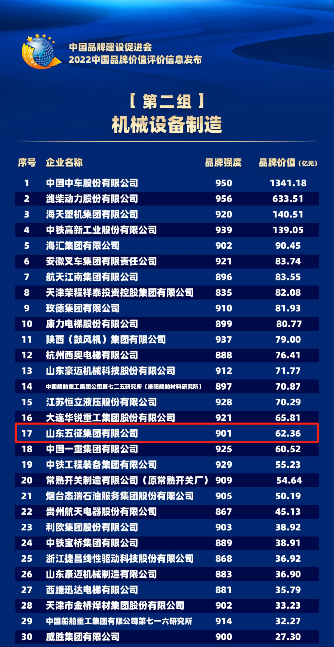 近日,中国品牌建设促进会、中国资产评估协会、新华社民族品牌工程办公室等单位在京联合发布“2022中国品牌价值评价信息”。五征集团以901的品牌强度、62.36亿元的品牌价值荣登机械设备制造领域第17名。