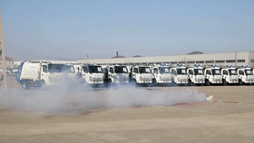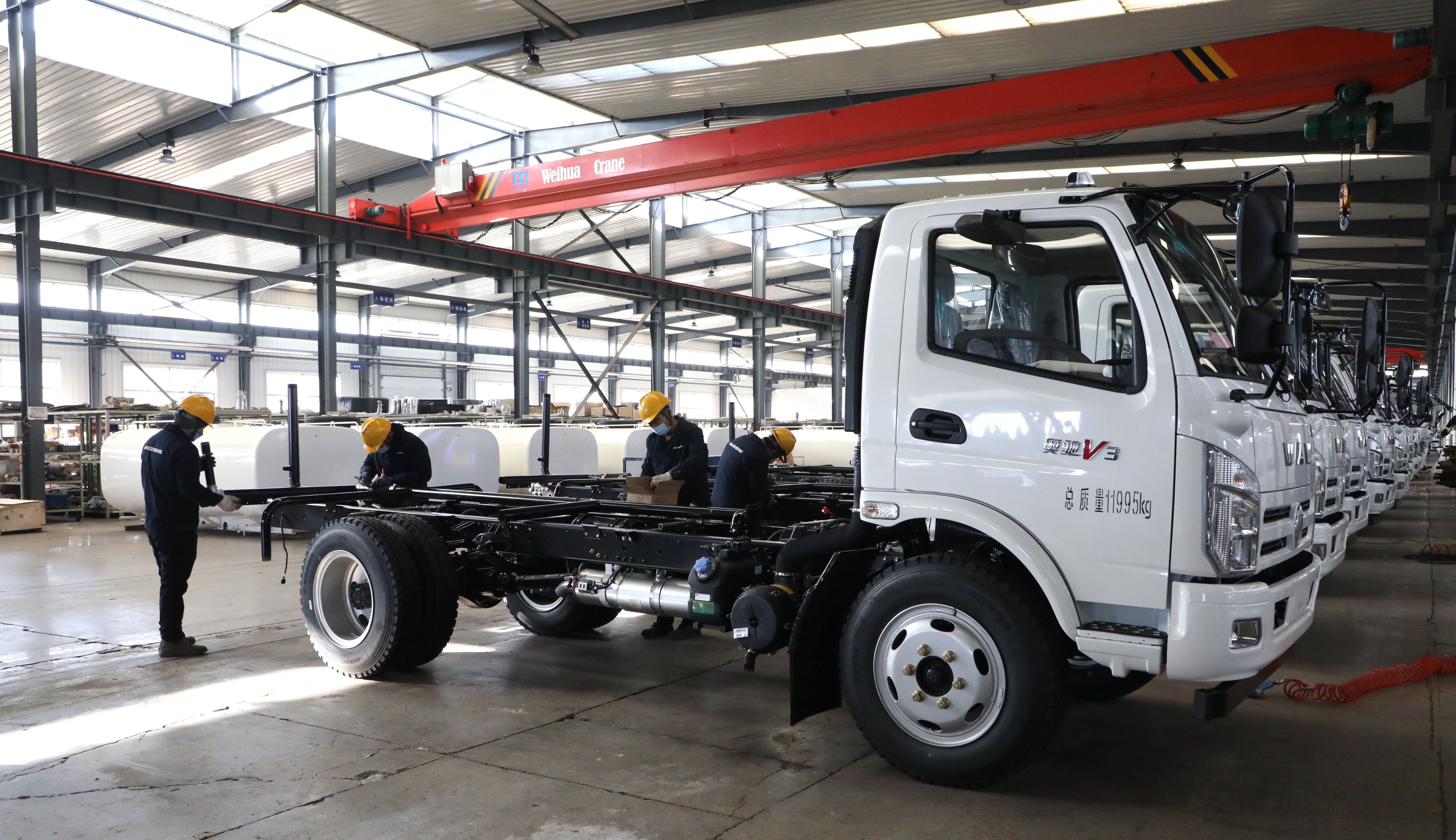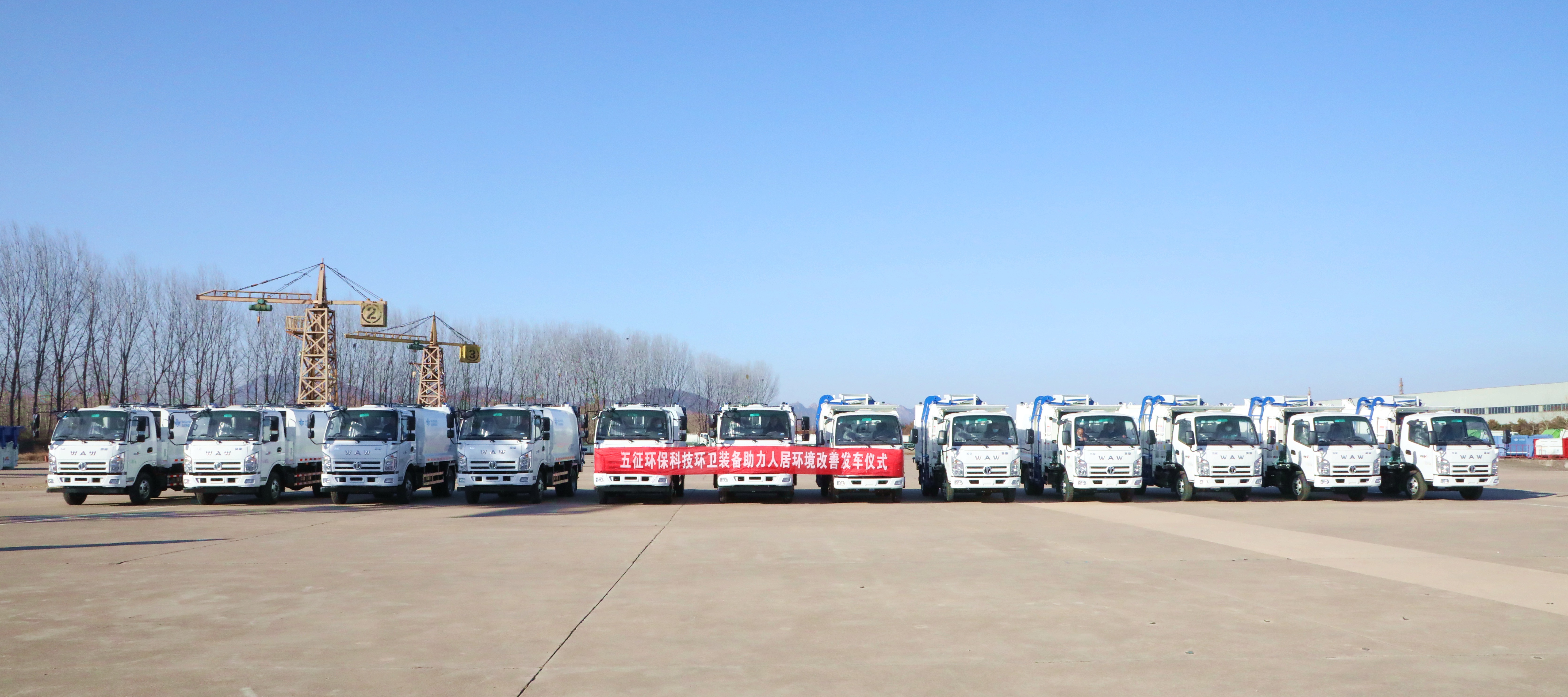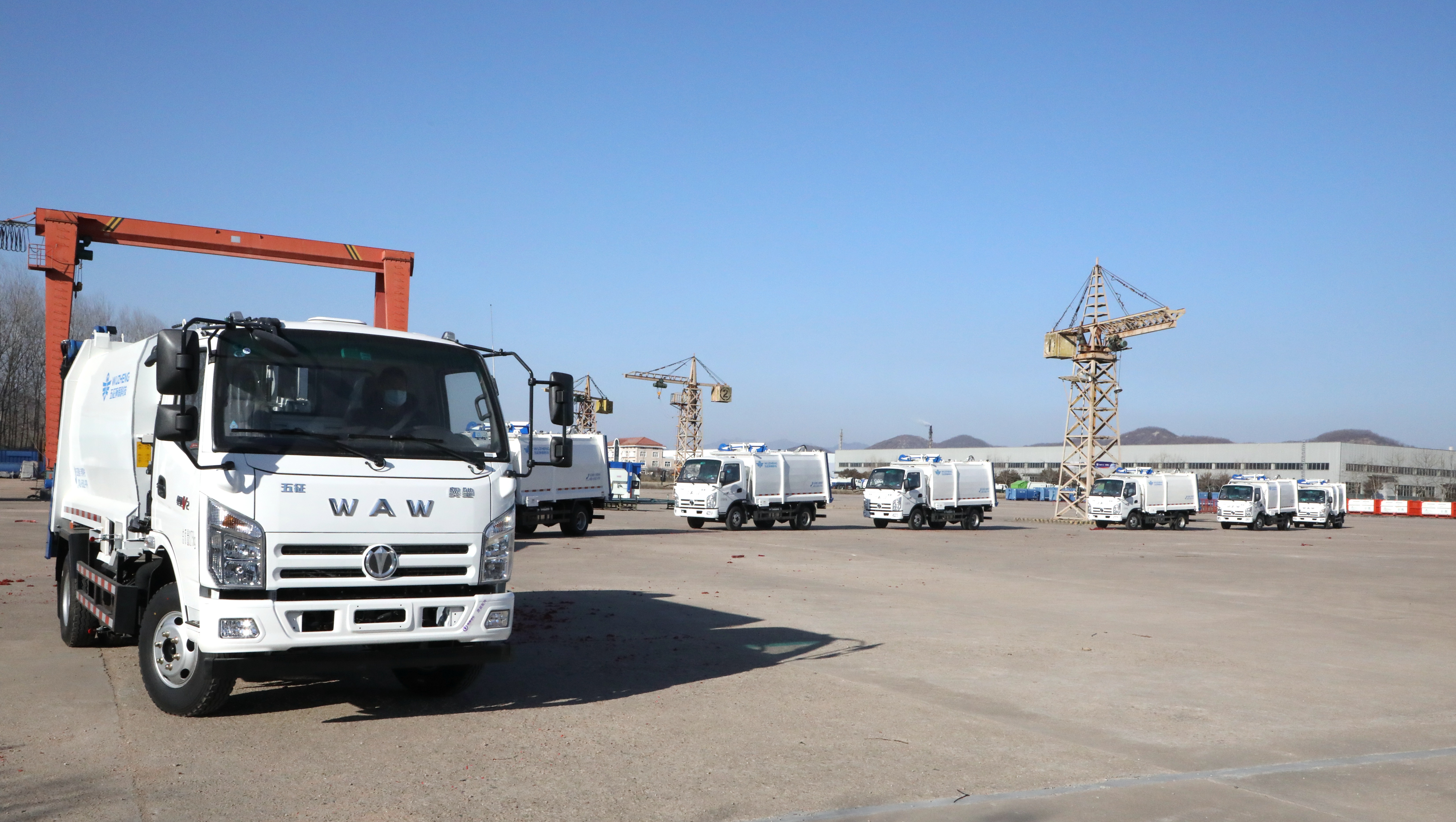 在环保科技发货场上,20多辆白蓝相间的五征环卫车辆在鞭炮声中接连起步,如同英姿飒爽的战士,走出厂门,助力环卫事业建设。