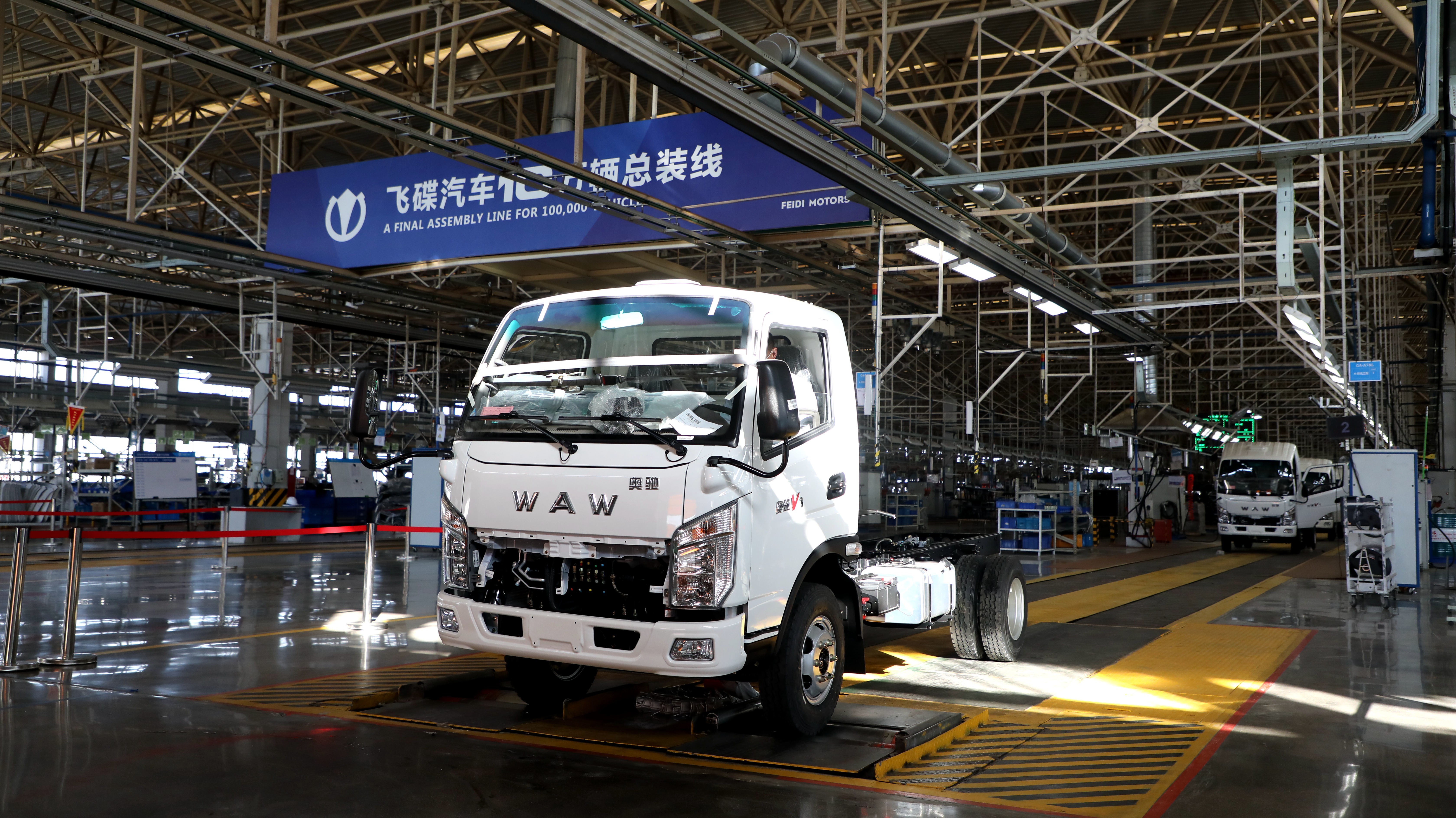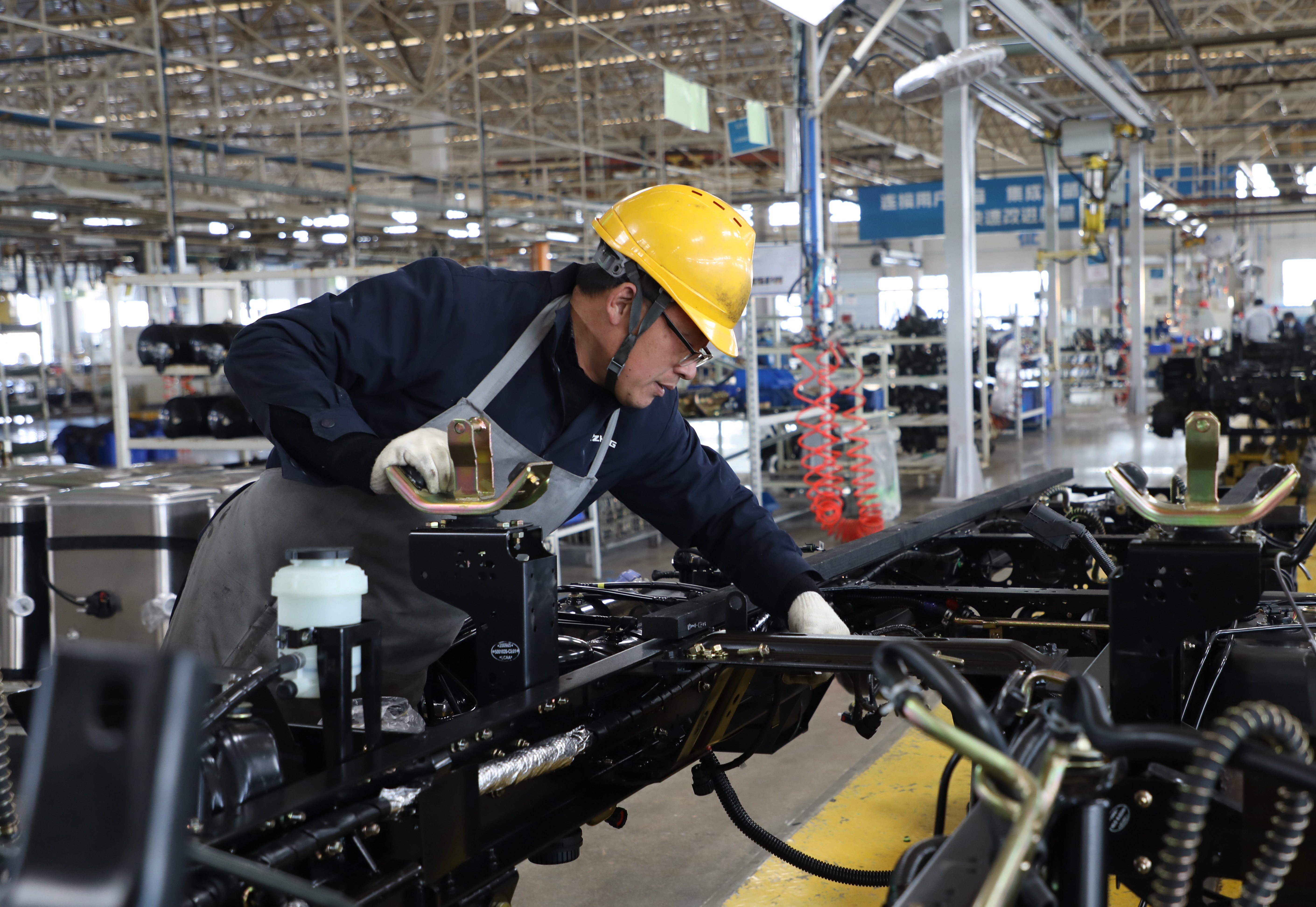 在汽车装配线上,各环节、各工序正开足马力满负荷生产,装配员工操作娴熟,整套动作行云流水,驾驶室布装、车架布装、发动机安装、轮胎安装……井然有序,一派繁忙的生产景象,每3分钟就有一辆飞碟汽车下线。