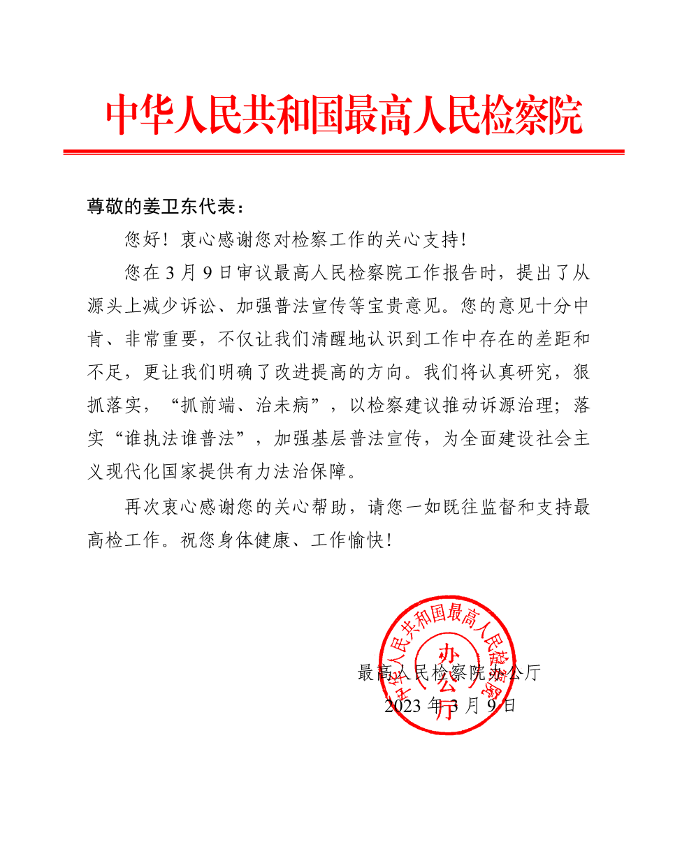 3月9日,最高人民检察院发函致谢姜卫东代表在审议最高人民检察院工作报告时,提出了从源头上减少诉讼、加强普法宣传等宝贵意见。