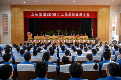 姜卫东在讲话中指出,2005年,是我们五征集团各项经济指标快速增长、各项事业全面发展的一年,更是企业整体水平快速提升、由传统制造业向现在制造业加速迈进的一年。经济运行质量持续提高。全年产销运输车42.5万辆,同比增长20.5%;产销农业机械2600余台,同比增长975%。实现销售收入50.4亿元,同比增长23%。经济效益综合指数达316.30%,比去年同期增加了14.16个百分点。以运输车辆为主的多元化发展格局已经构成。运输车辆、电动车、农业装备和汽车配件四个产业,不仅实现了量的突破,更重要的是实现了质的飞跃。五征品牌形象进一步提升 ,社会影响进一步扩大,发展环境越来越好,中央、省、市领导多次莅临五征集团视察,董事长姜卫东荣获全国劳动模范称号,控股浙江飞碟汽车公司,获得汽车目录,成功进入汽车制造业。生产条件不断改善,装备水平不断提高,生产能力迅速扩大。全年共完成技术改造项目30多项。投资1亿元的轻型车二期工程和农业装备生产线竣工投产。产品设计水平不断提升,产品开发能力进一步增强,市场竞争优势日益突出。全年共开发、完善200余个车型,新开发的5款年度车型- “福尔达”系列产品陆续投产,汽车成为主导产业的优势已突出。基础教育与专业化培训并重,员工学习能力增强,素质不断提高。举办各类培训班70多期,培训人员达5000多人次。另有吉林大学3名农机化专业硕士生、9名汽车专业本科生及13名山东大学本科生签订了加盟五征协议。理顺完善机制,管理水平不断提升。通过内部整顿,进一步明确部门(岗位)职责与标准,增强了干部员工的责任心和事业心,实施信息化(ERP)改造,使产品开发、采购、检验、仓储、生产到产品销售的整个流程不断优化,管理日趋科学、理性。公司顺利通过了国家机械工业“
