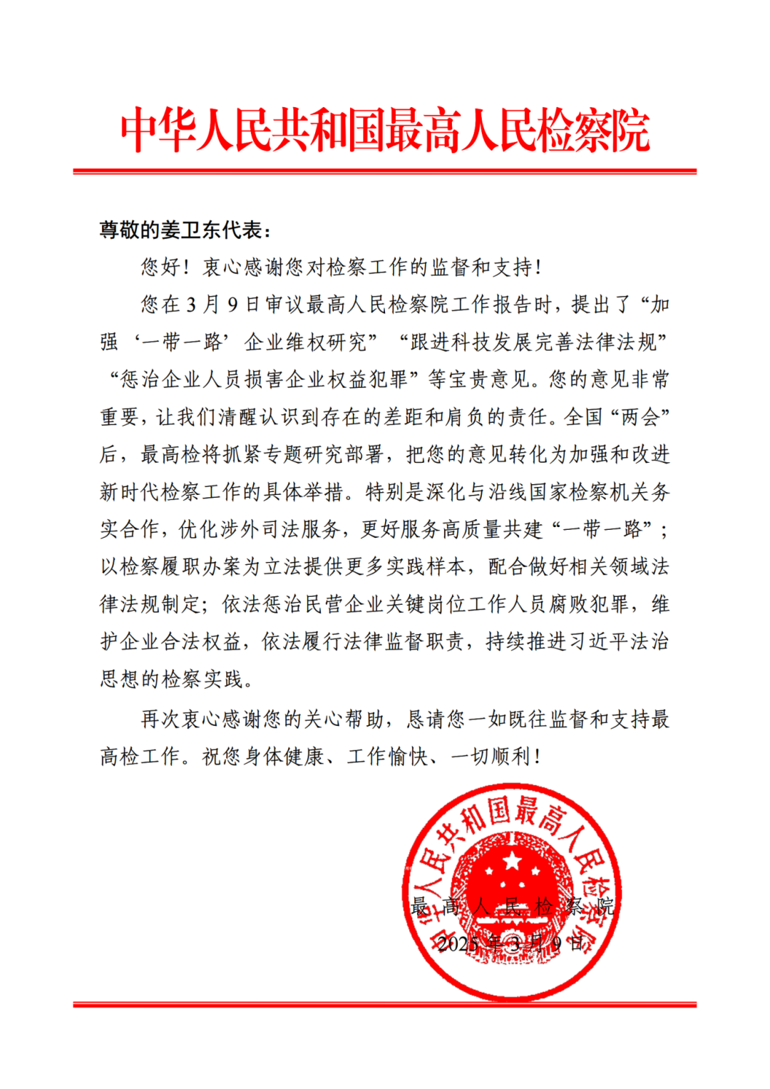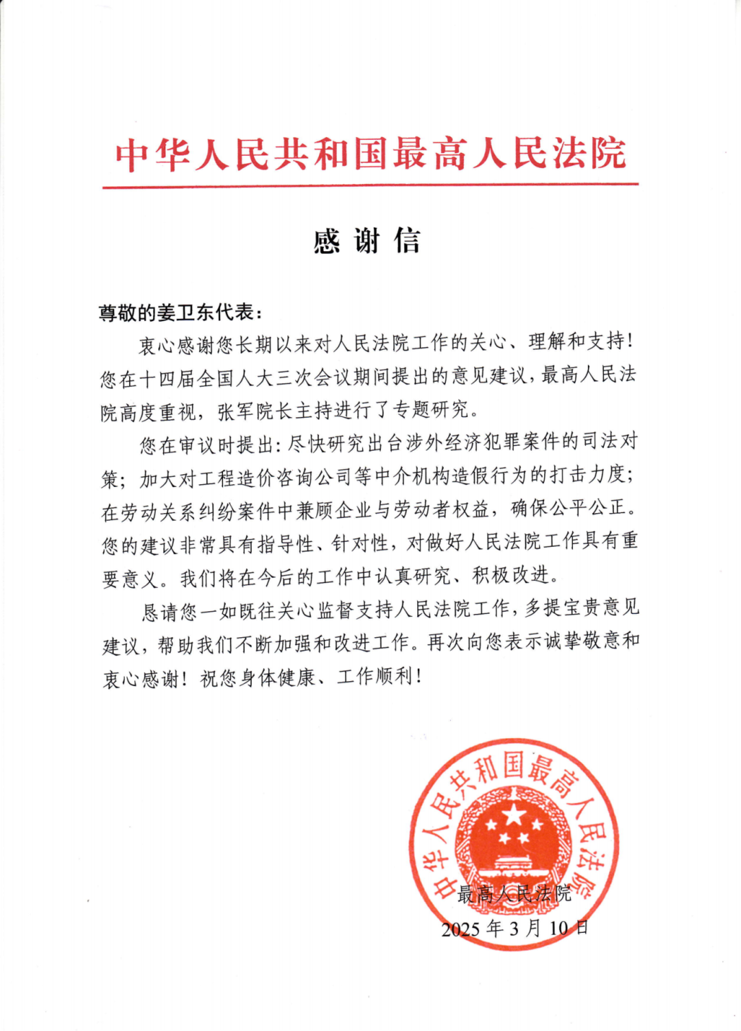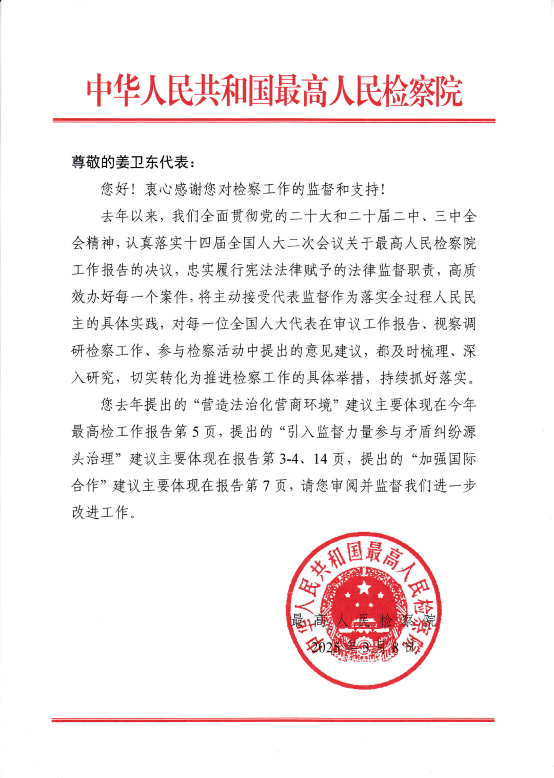 姜卫东在审议“两高”报告时提出的建议得到了最高人民法院、最高人民检察院的高度评价。